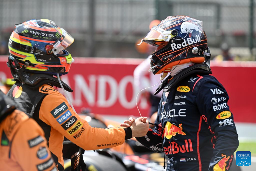 Red Bull Racing's Dutch driver Max Verstappen (R) celebrates with McLaren's Australian driver Oscar Piastri after the Sprint Race of the Formula One Belgian Grand Prix at the Spa-Francorchamps circuit in Stavelot, Belgium, July 26, 2025. (Xinhua/Zhao Dingzhe)
