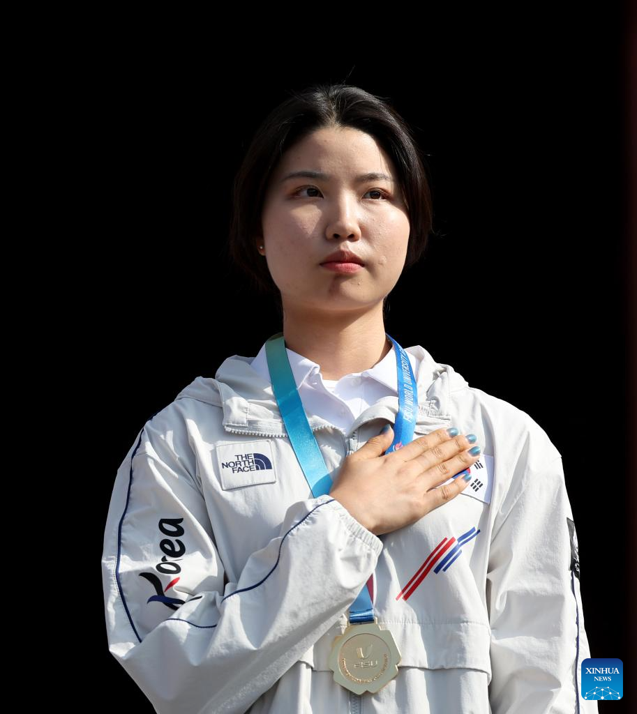 Nam Suhyeon of South Korea poses during the awarding ceremony for the women's recurve individual gold medal match of archery at the Rhine-Ruhr 2025 FISU World University Games in Essen, Germany, July 26, 2025. (Xinhua/Li Ying)
