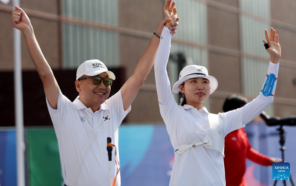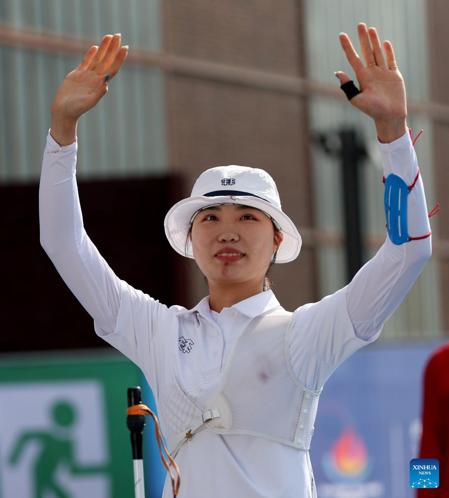 Nam Suhyeon of South Korea celebrates after the women's recurve individual gold medal match of archery at the Rhine-Ruhr 2025 FISU World University Games in Essen, Germany, July 26, 2025. (Xinhua/Li Ying)