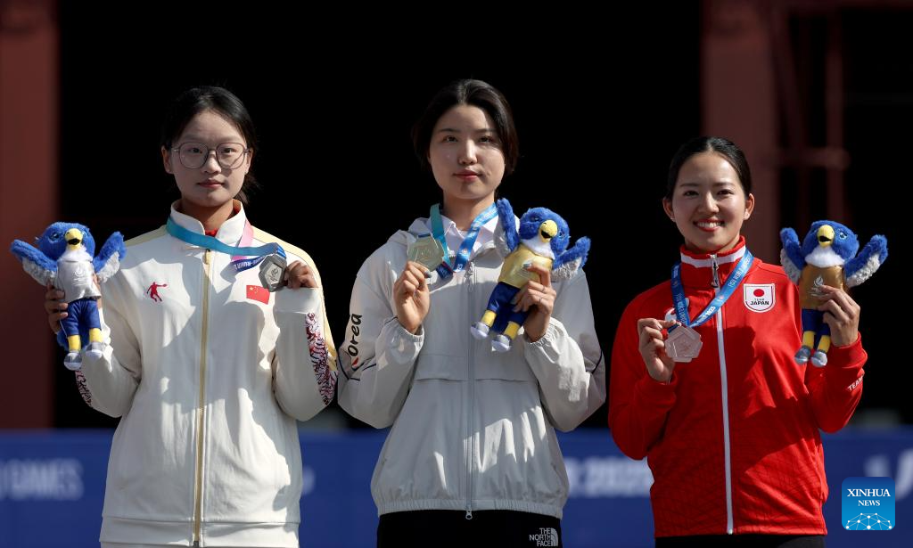 Gold medalist Nam Suhyeon of South Korea (C), silver medalist Liu Yanxiu of China (L) and bronze medalist Uehara Ruka of Japan pose during the awarding ceremony for the women's recurve individual gold medal match of archery at the Rhine-Ruhr 2025 FISU World University Games in Essen, Germany, July 26, 2025. (Xinhua/Li Ying)