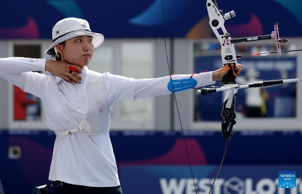Nam Suhyeon of South Korea competes during the women's recurve individual gold medal match of archery at the Rhine-Ruhr 2025 FISU World University Games in Essen, Germany, July 26, 2025. (Xinhua/Li Ying)