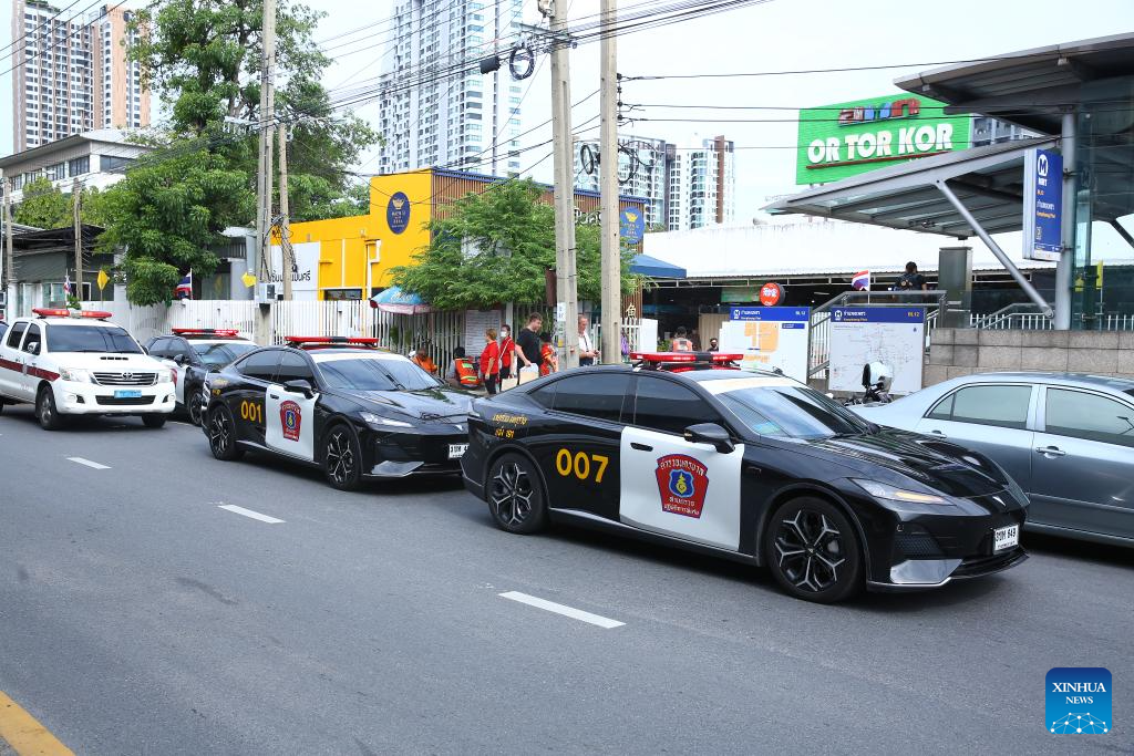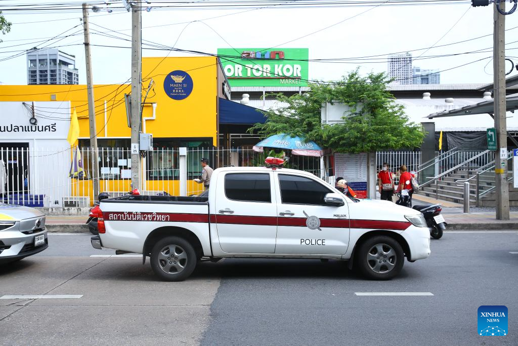 A security officer is on guard near the site of a shooting incident in Bangkok, Thailand, July 28, 2025. At least six people were killed in a shooting incident in Thailand's capital Bangkok on Monday, local media Thairath reported. The gunman opened fire in a market before killing himself, the report said. (Xinhua/Sun Weitong)