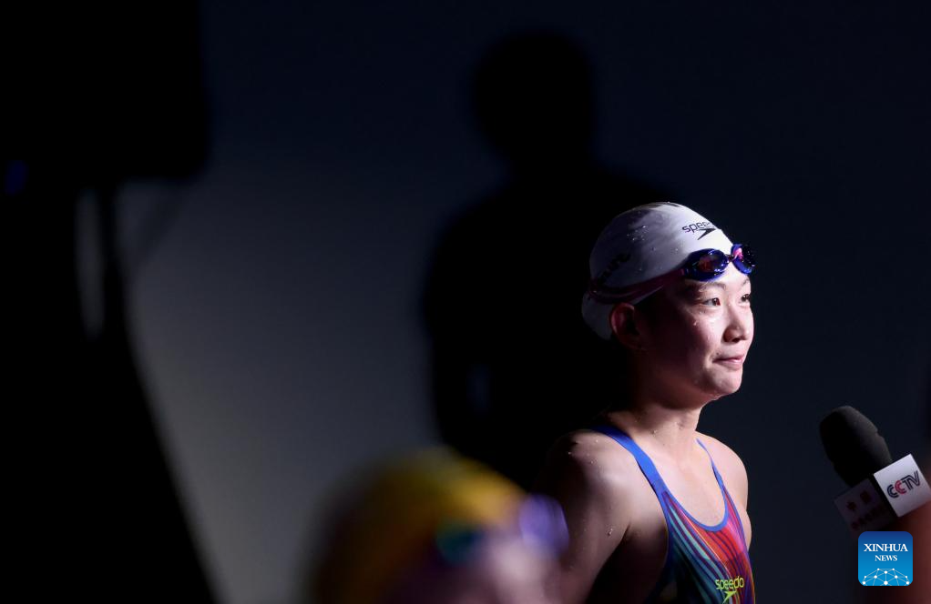 Li Bingjie of China is interviewed after the women's 200m freestyle semifinal of swimming at the World Aquatics Championships in Singapore, July 29, 2025. (Xinhua/Luo Yuan)