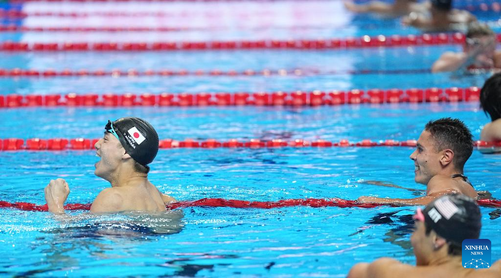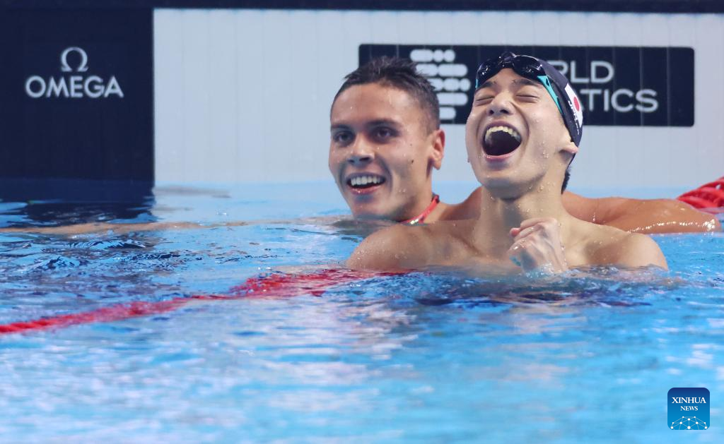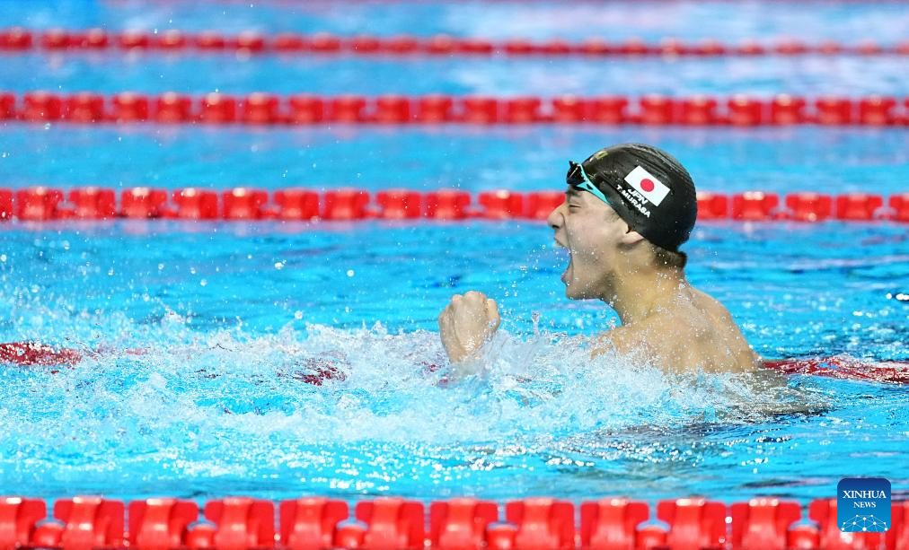 Murasa Tatsuya of Japan celebrates after the men's 200m freestyle final of swimming at the World Aquatics Championships in Singapore, July 29, 2025. (Xinhua/Xue Yuge)