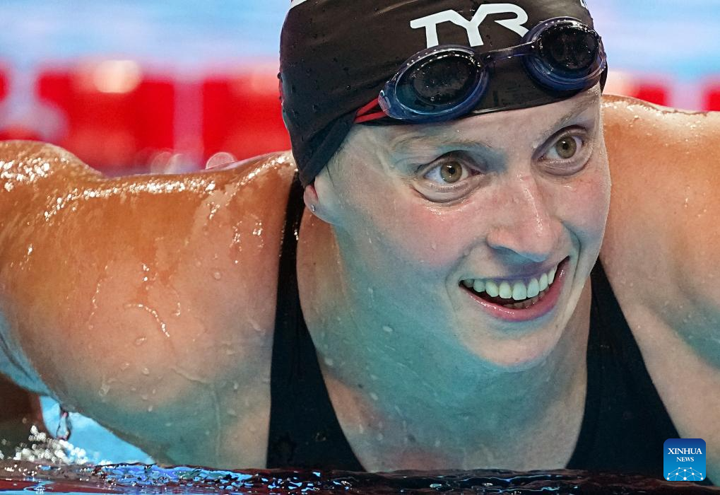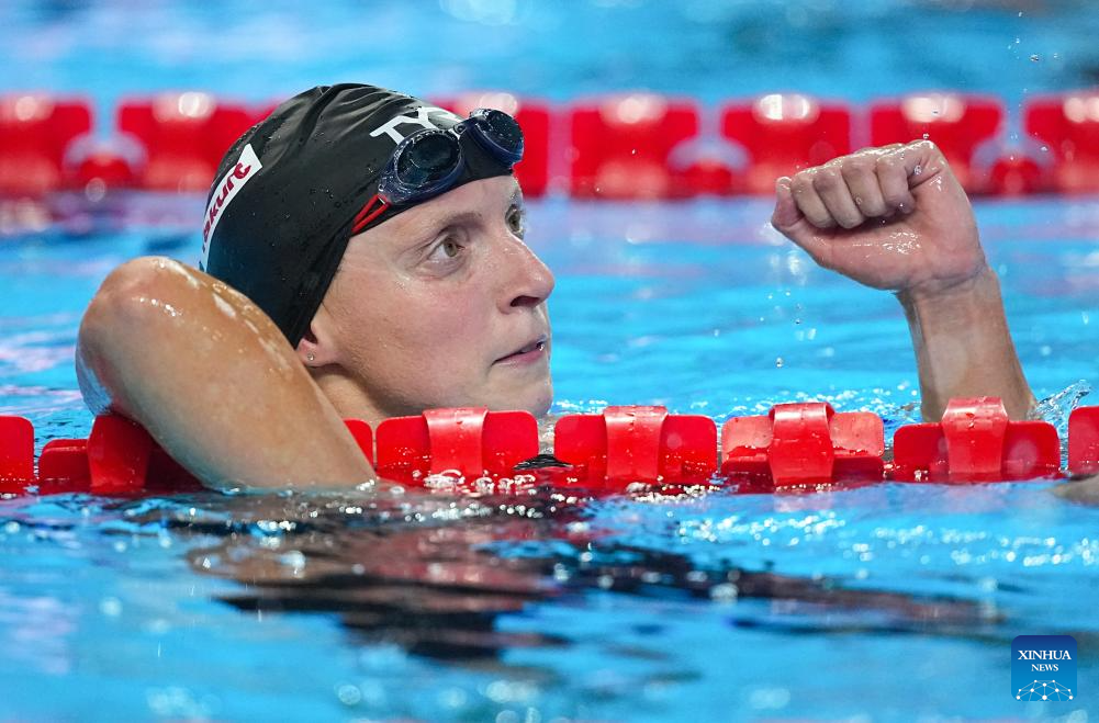 Katie Ledecky of the United States reacts after the women's 1500m freestyle final of swimming at the World Aquatics Championships in Singapore, July 29, 2025. (Xinhua/Xue Yuge)