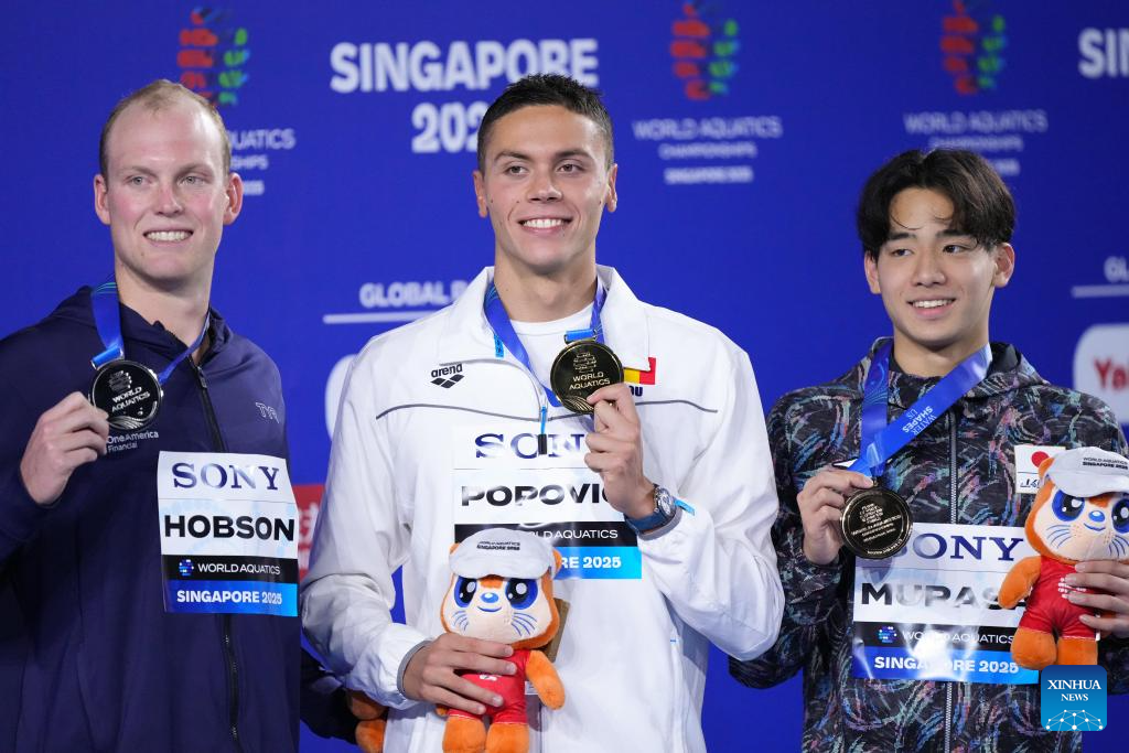 Gold medalist David Popovici (C) of Romania, silver medalist Luke Hobson (L) of the United States and bronze medalist Murasa Tatsuya of Japan pose during the awarding ceremony for the men's 200m freestyle final of swimming at the World Aquatics Championships in Singapore, July 29, 2025. (Xinhua/Luo Yuan)