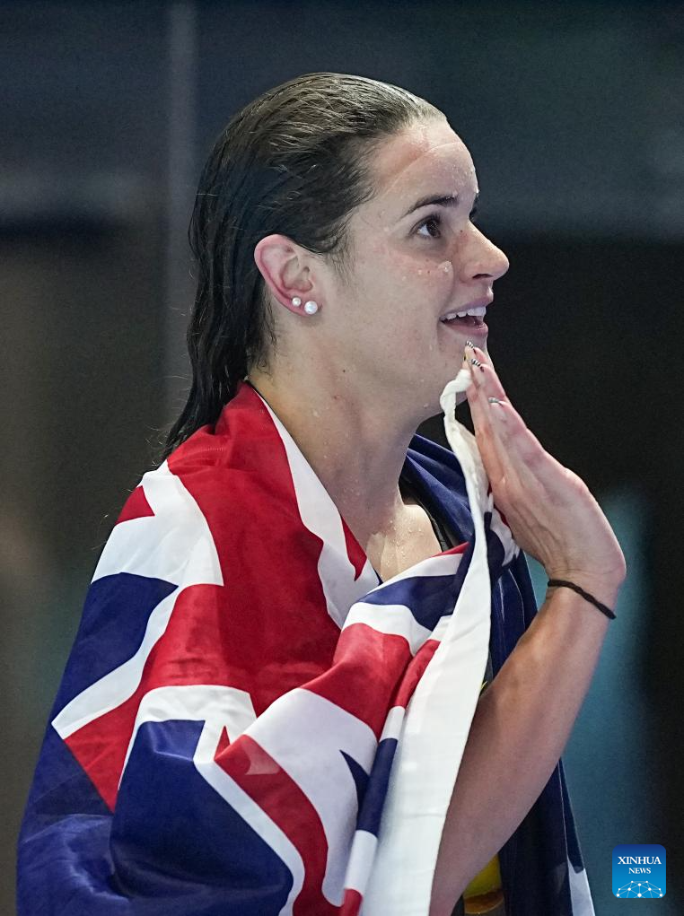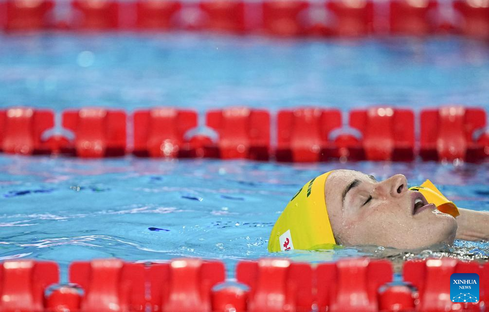Kaylee McKeown of Australia is seen after the women's 100m backstroke final of swimming at the World Aquatics Championships in Singapore, July 29, 2025. (Xinhua/Xue Yuge)