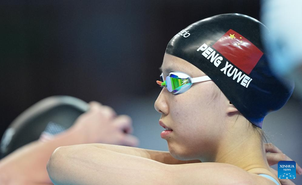 Peng Xuwei of China is seen before the women's 100m backstroke final of swimming at the World Aquatics Championships in Singapore, July 29, 2025. (Xinhua/Xue Yuge)