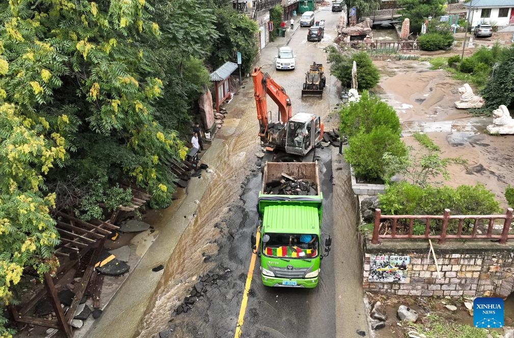 An aerial drone photo taken on July 29, 2025 shows engineering vehicles taking part in the repair of a road in Changzhou Village of Xiaying Town in Jizhou District, north China's Tianjin. Heavy rainfall has affected Jizhou District for days and triggered mountain floods. Relief and restoration efforts are underway to resume normal production and life order as early as possible. (Xinhua/Li Ran)