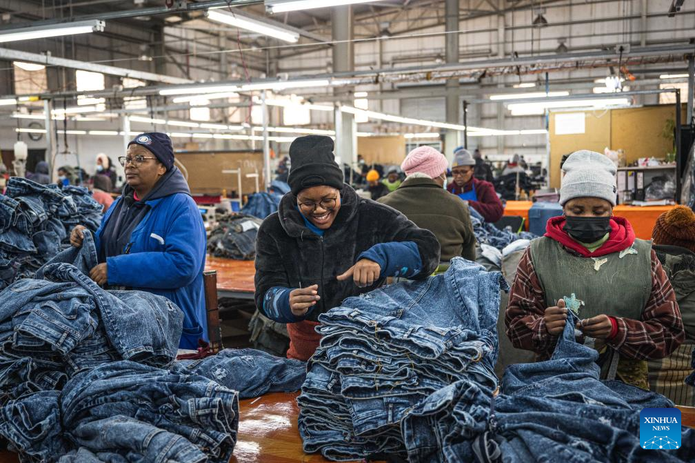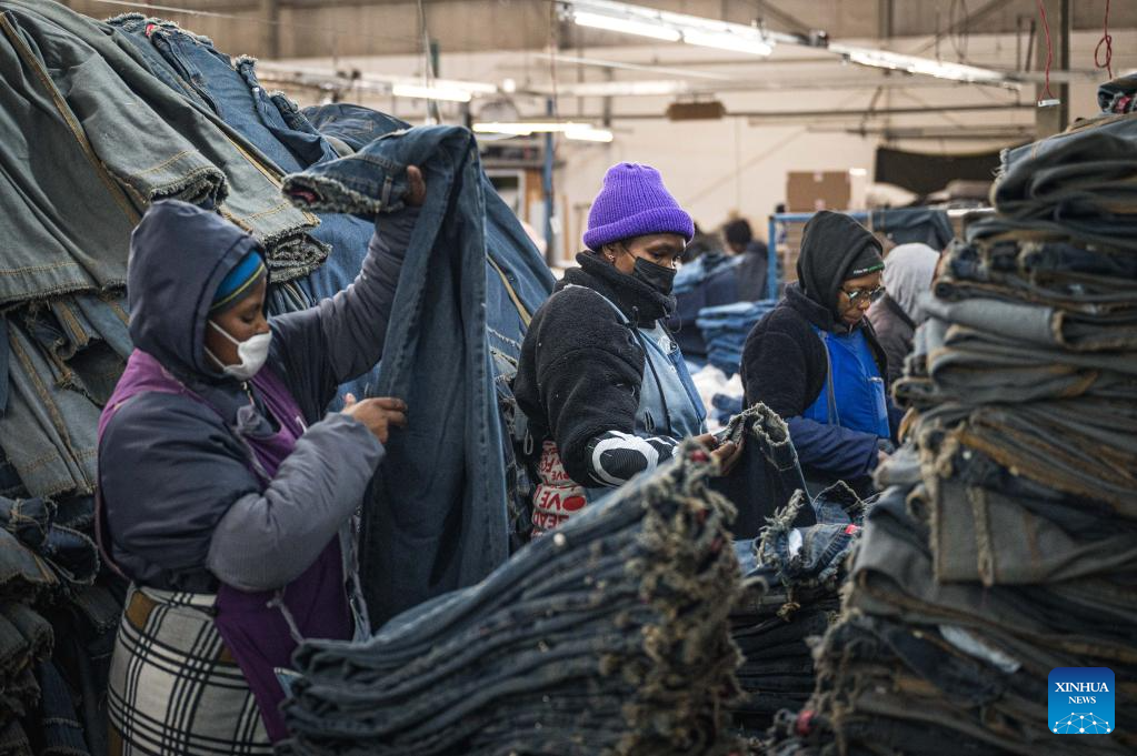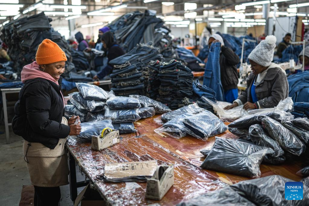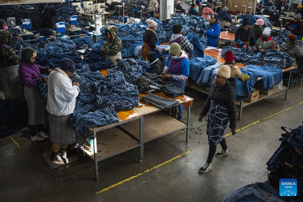 Workers arrange jeans at the Afri-Expo Textile Factory in Maseru, the capital of Lesotho, July 29, 2025. Lesotho is a small southern African country and one of the world's least developed countries. Its economy is heavily dependent on textile exports. It exports over 50 percent of its garment products to the United States. (Xinhua/Wang Guansen)