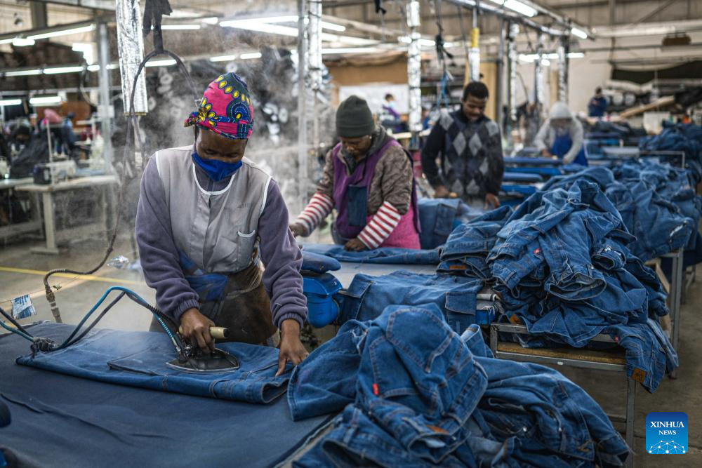 Workers iron jeans at the Afri-Expo Textile Factory in Maseru, the capital of Lesotho, July 29, 2025. Lesotho is a small southern African country and one of the world's least developed countries. Its economy is heavily dependent on textile exports. It exports over 50 percent of its garment products to the United States. (Xinhua/Wang Guansen)