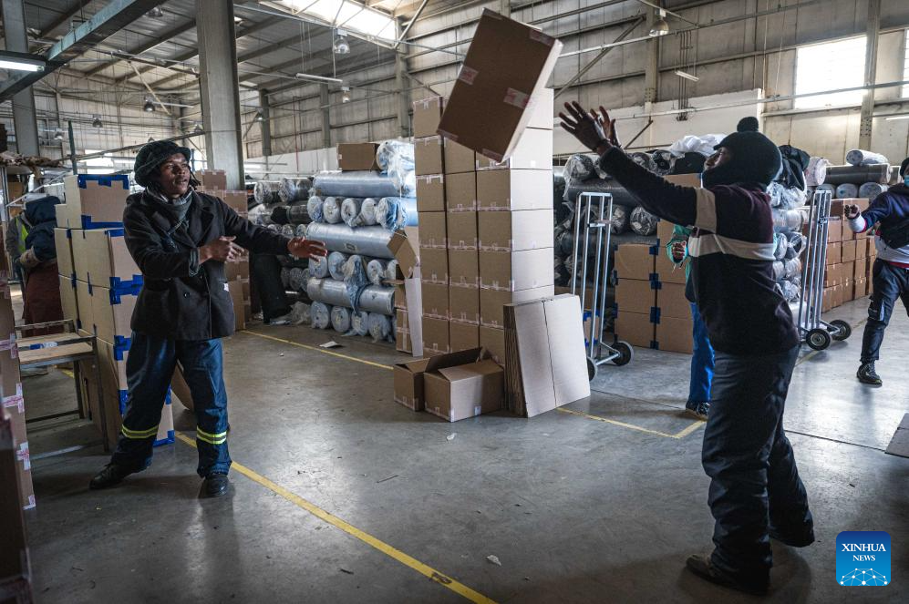 Workers transfer a box of clothes at the Afri-Expo Textile Factory in Maseru, the capital of Lesotho, July 29, 2025. Lesotho is a small southern African country and one of the world's least developed countries. Its economy is heavily dependent on textile exports. It exports over 50 percent of its garment products to the United States. (Xinhua/Wang Guansen)