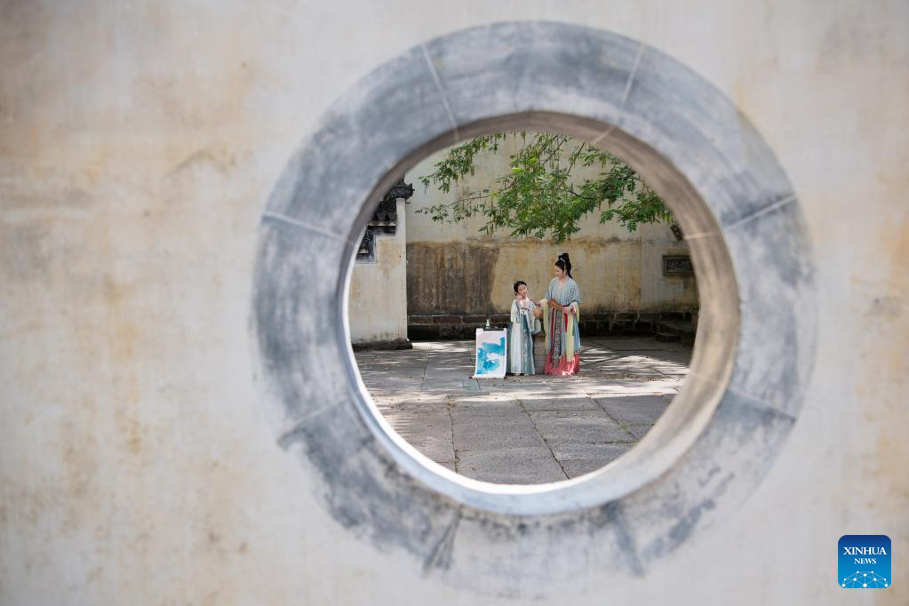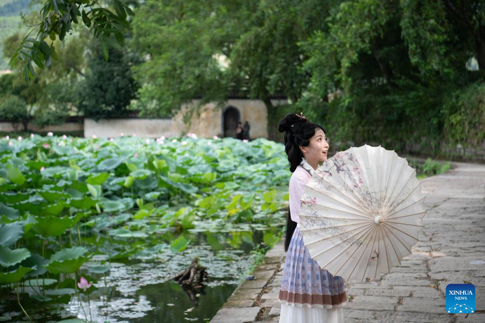 A tourist poses for photos in Chengkan Village, Huizhou District of Huangshan City, east China's Anhui Province, July 25, 2025.