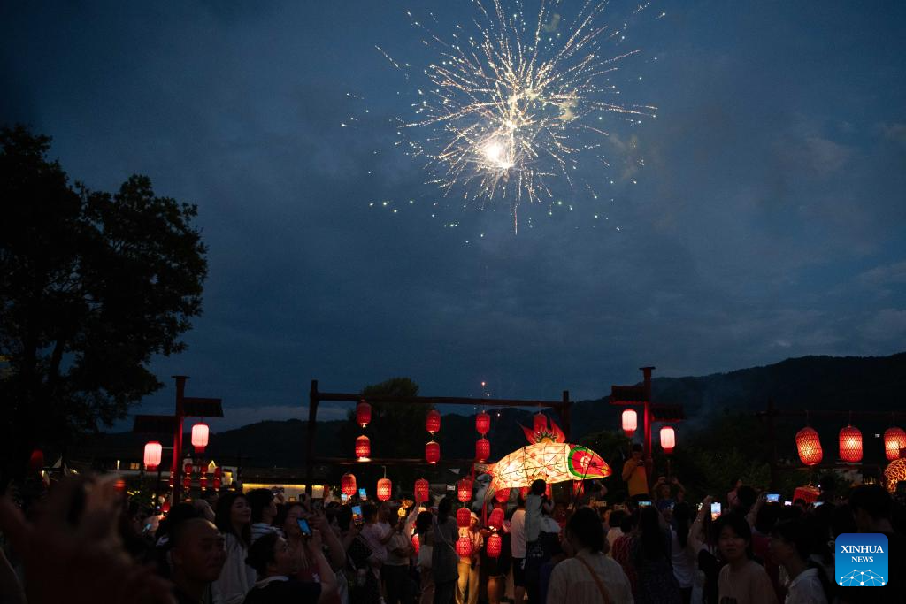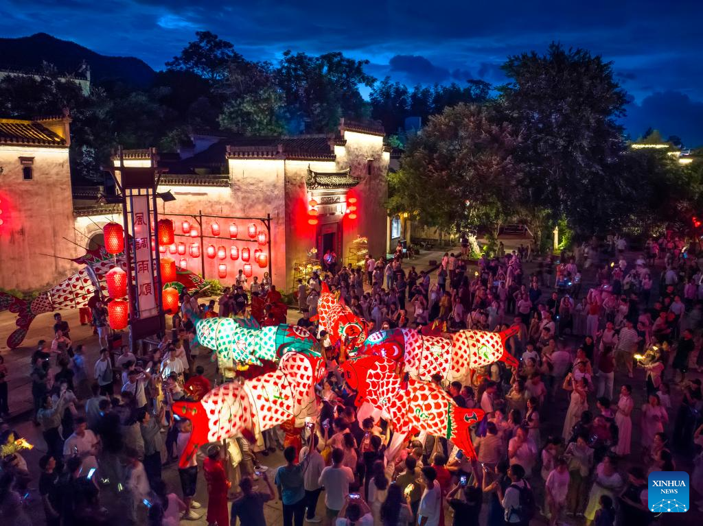 Tourists watch a fish lantern parade in Chengkan Village, Huizhou District of Huangshan City, east China's Anhui Province, July 25, 2025.