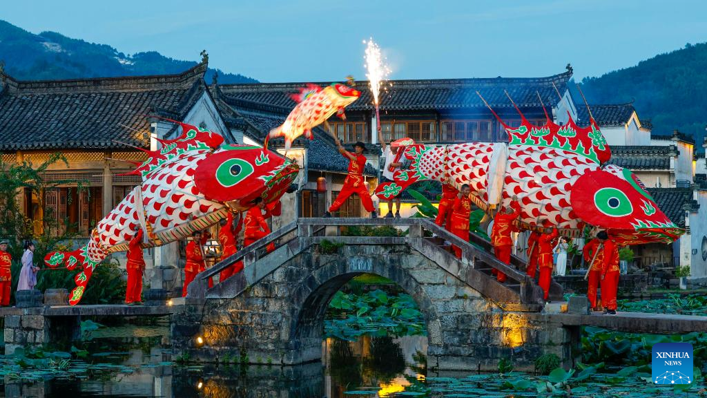 A fish lantern team parades in Chengkan Village, Huizhou District of Huangshan City, east China's Anhui Province, June 30, 2025.