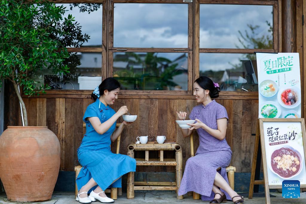 Tourists chat outside a beverage shop in Chengkan Village, Huizhou District of Huangshan City, east China's Anhui Province, July 28, 2025.