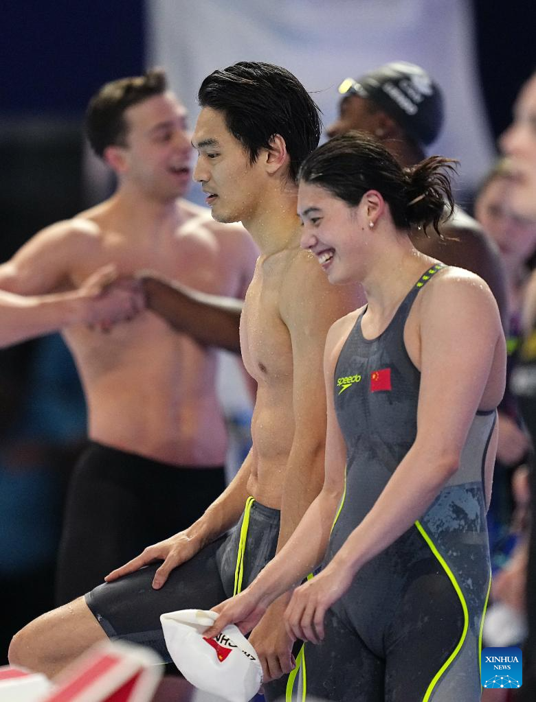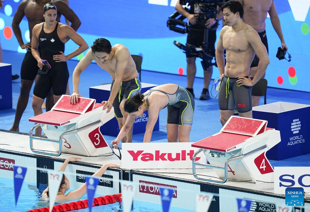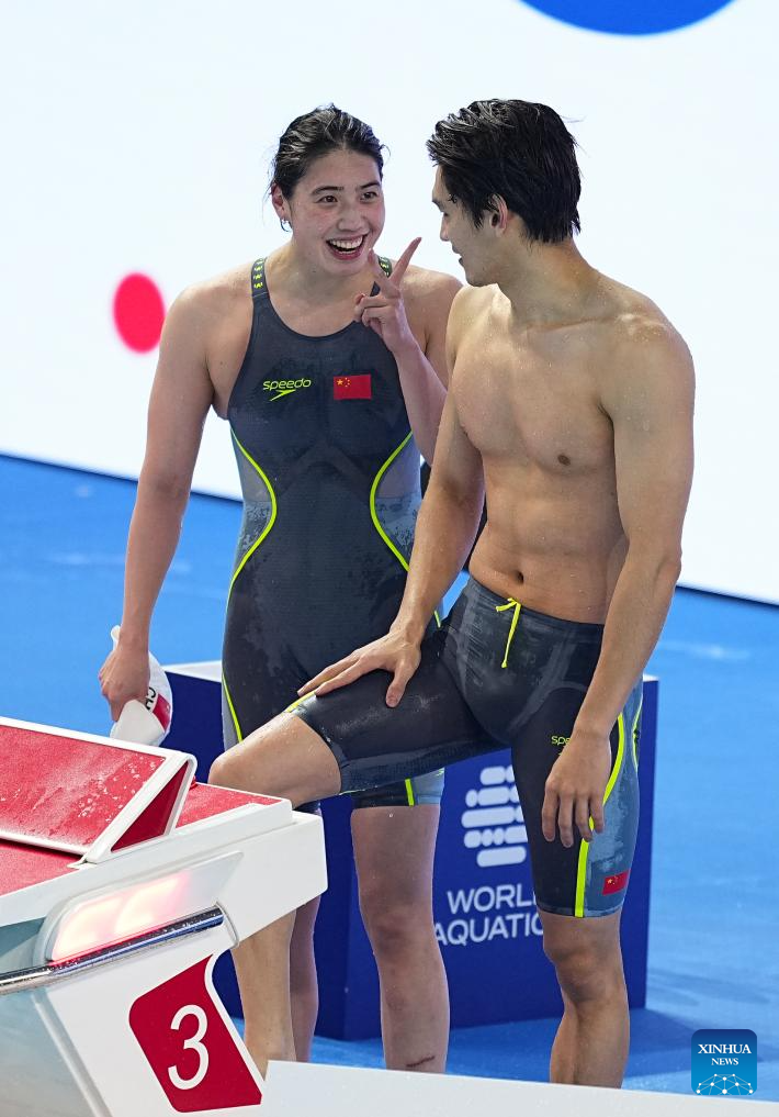 Team China's Xu Jiayu (L front) and Zhang Yufei are seen after the mixed 4x100m medley relay final of swimming at the World Aquatics Championships in Singapore, July 30, 2025. (Xinhua/Xia Yifang)