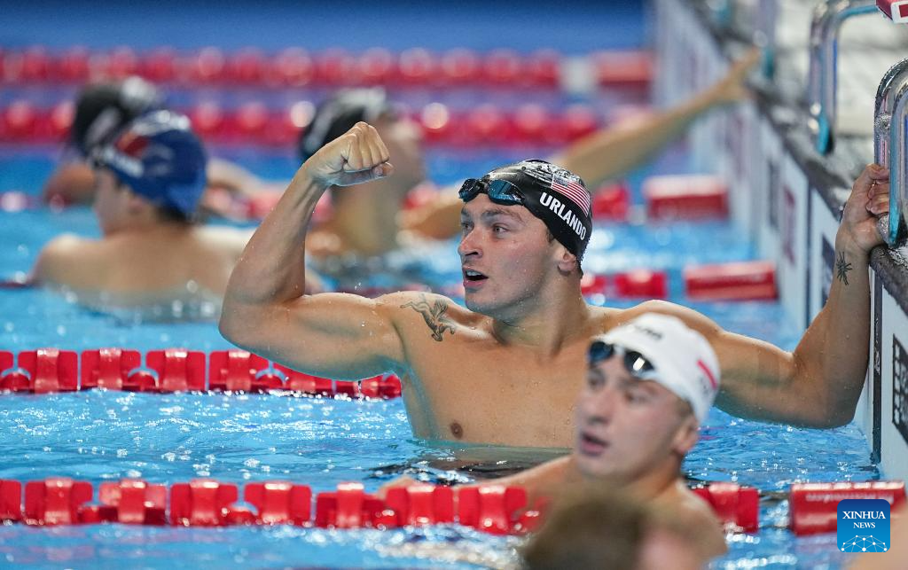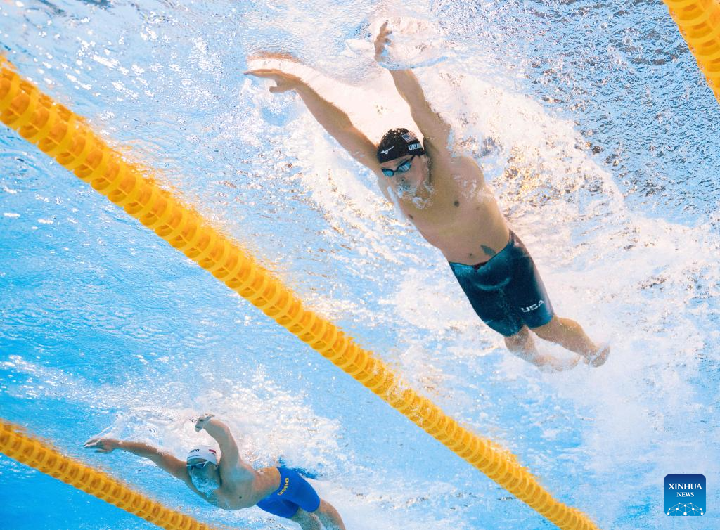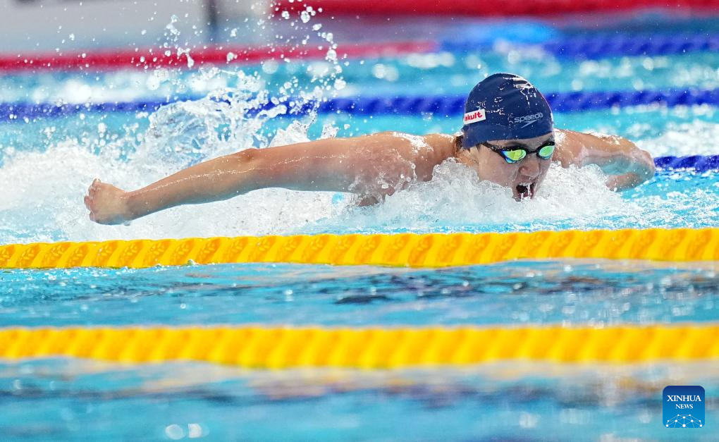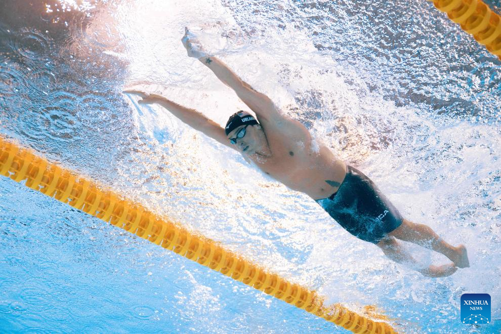 Luca Urlando of the United States competes during the men's 200m butterfly final of swimming at the World Aquatics Championships in Singapore, July 30, 2025. (Xinhua/Xue Yuge)