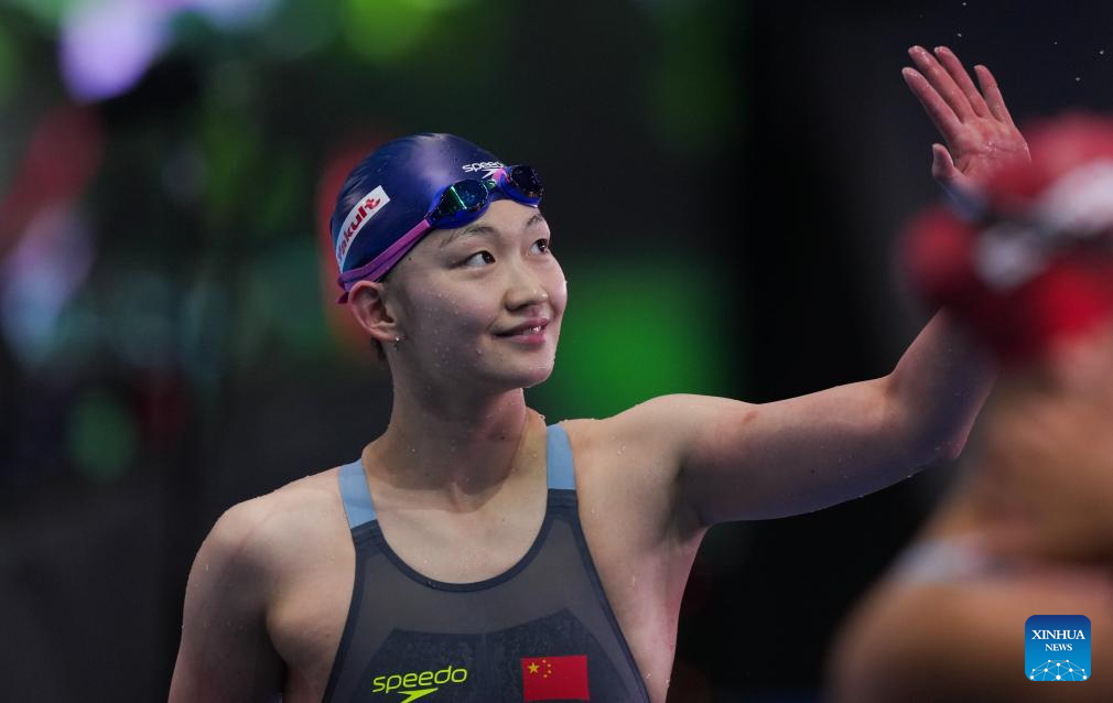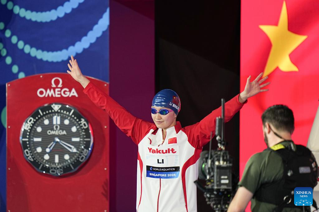 Li Bingjie of China waves to the spectators after the women's 200m freestyle final of swimming at the World Aquatics Championships in Singapore, July 30, 2025. (Xinhua/Wu Zhizun)
