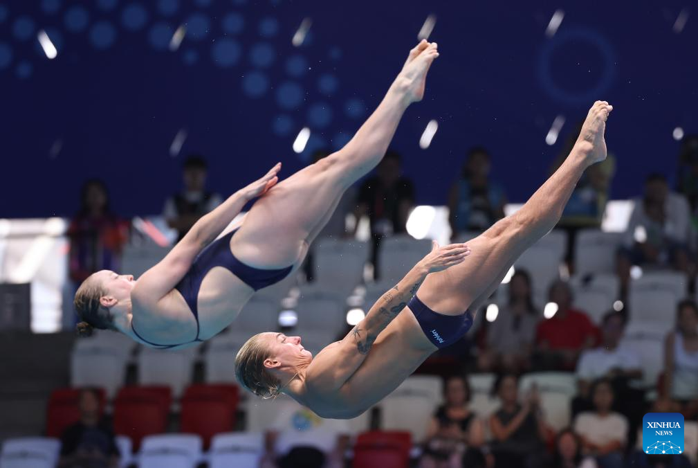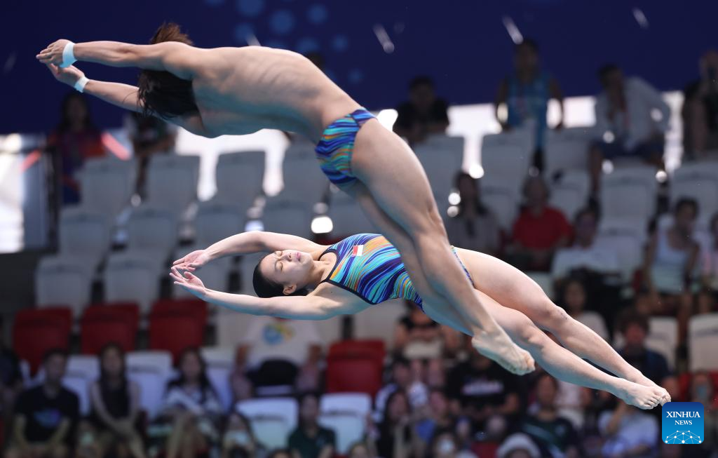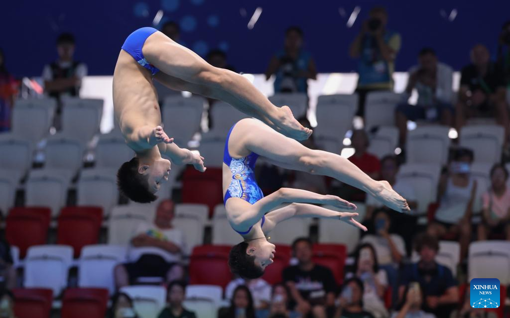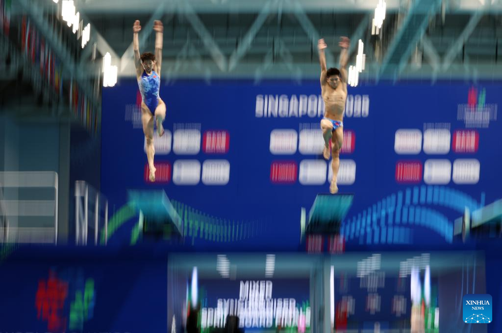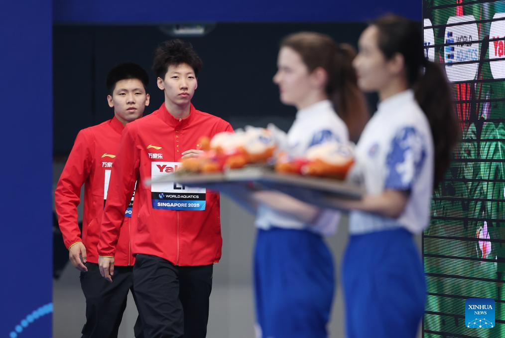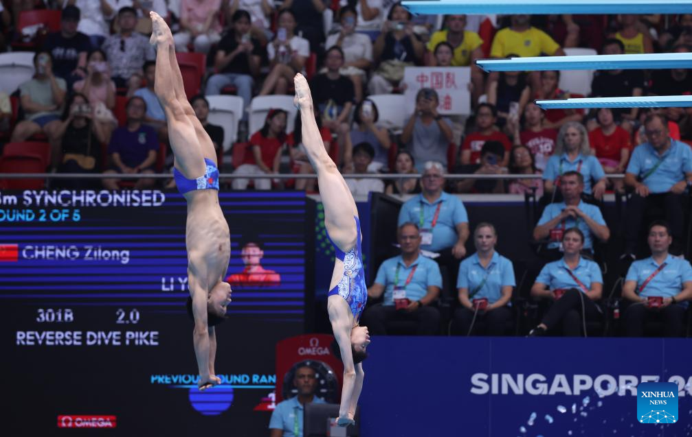 Li Yajie/Cheng Zilong (L) of China are seen during the mixed synchronised 3m springboard final of diving at the World Aquatics Championships in Singapore, July 30, 2025. (Xinhua/Luo Yuan)