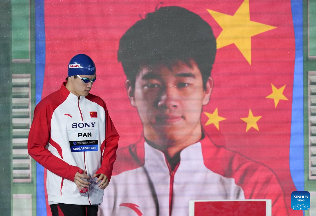 Pan Zhanle of China is seen before the men's 100m freestyle semifinal of swimming at the World Aquatics Championships in Singapore, July 30, 2025. (Xinhua/Xia Yifang)