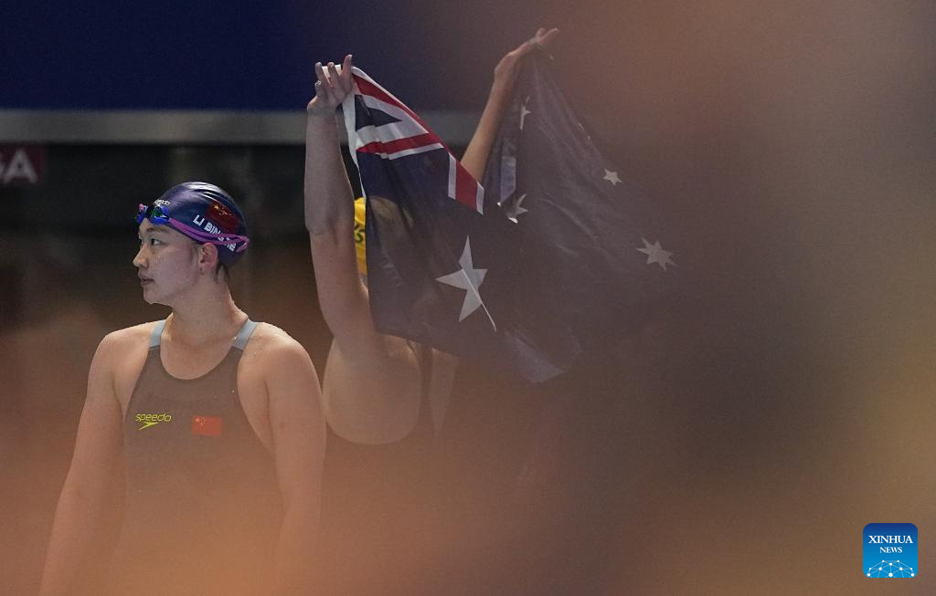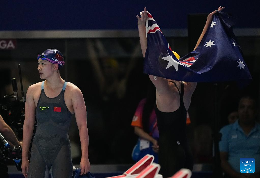 Mollie O'Callaghan (R) of Australia competes during the women's 200m freestyle final of swimming at the World Aquatics Championships in Singapore, July 30, 2025. (Xinhua/Xue Yuge)