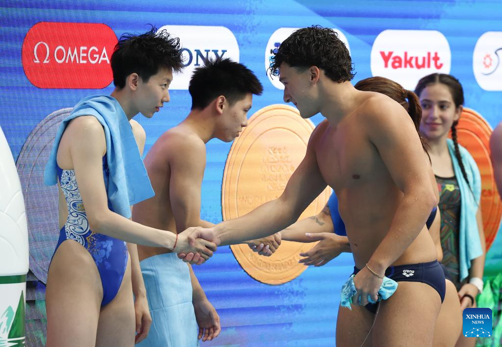 Chiara Pellacani/Matteo Santoro (R front) of Italy shake hands with Li Yajie (1st L)/Cheng Zilong (2nd L) of China after they finished their last diving during the mixed synchronised 3m springboard final of diving at the World Aquatics Championships in Singapore, July 30, 2025. (Xinhua/Luo Yuan)