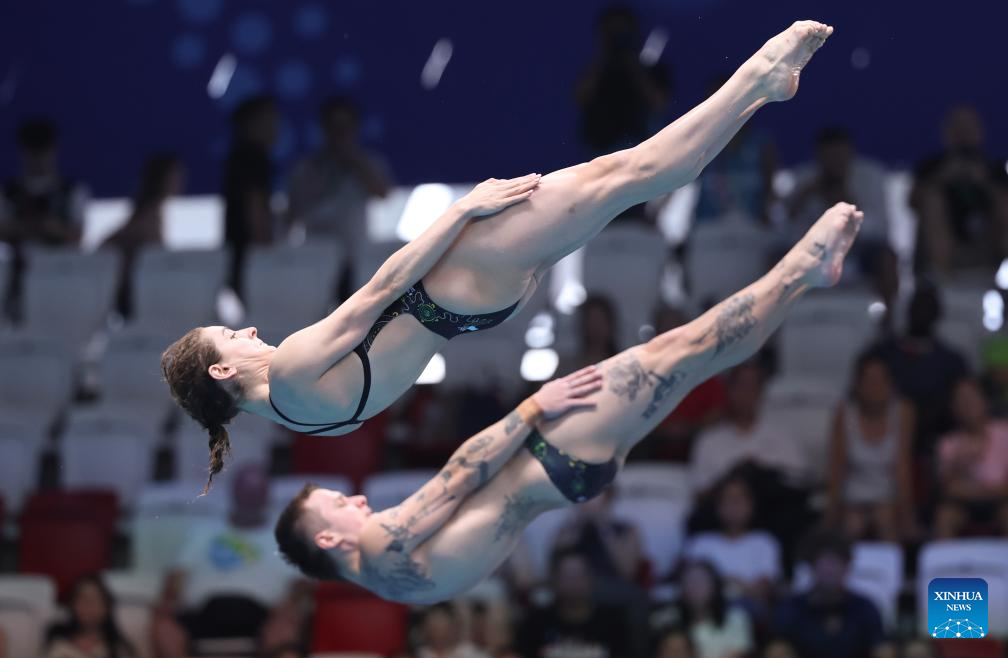 Noah George Penman /Grace Reid (L) of Britain compete during the mixed synchronised 3m springboard final of diving at the World Aquatics Championships in Singapore, July 30, 2025. (Xinhua/Luo Yuan)