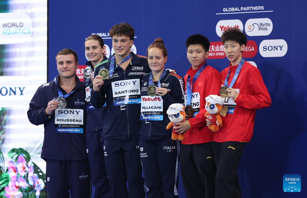 Gold medalists Chiara Pellacani (3rd R)/Matteo Santoro (3rd L) of Italy pose with silver medalists Maddison Keeney (2nd L)/Cassiel Rousseau (1st L) of Australia and bronze medalists Li Yajie (1st R)/Cheng Zilong of China during the awarding ceremony for the mixed synchronised 3m springboard final of diving at the World Aquatics Championships in Singapore, July 30, 2025. (Xinhua/Luo Yuan)