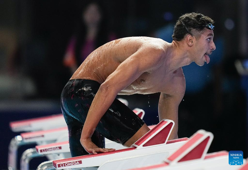 Ahmed Jaouadi of Tunisia is seen before the men's 800m freestyle final of swimming at the World Aquatics Championships in Singapore, July 30, 2025. (Xinhua/Xia Yifang)
