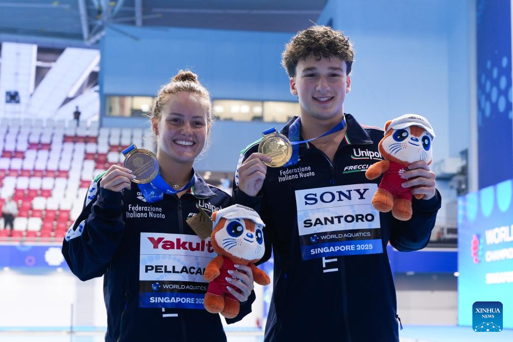 Gold medalists Chiara Pellacani/Matteo Santoro (R) of Italy pose after the awarding ceremony for the mixed synchronised 3m springboard final of diving at the World Aquatics Championships in Singapore, July 30, 2025. (Xinhua/Luo Yuan)