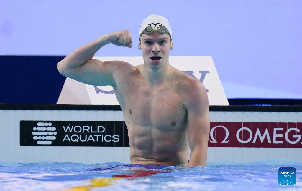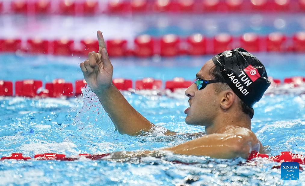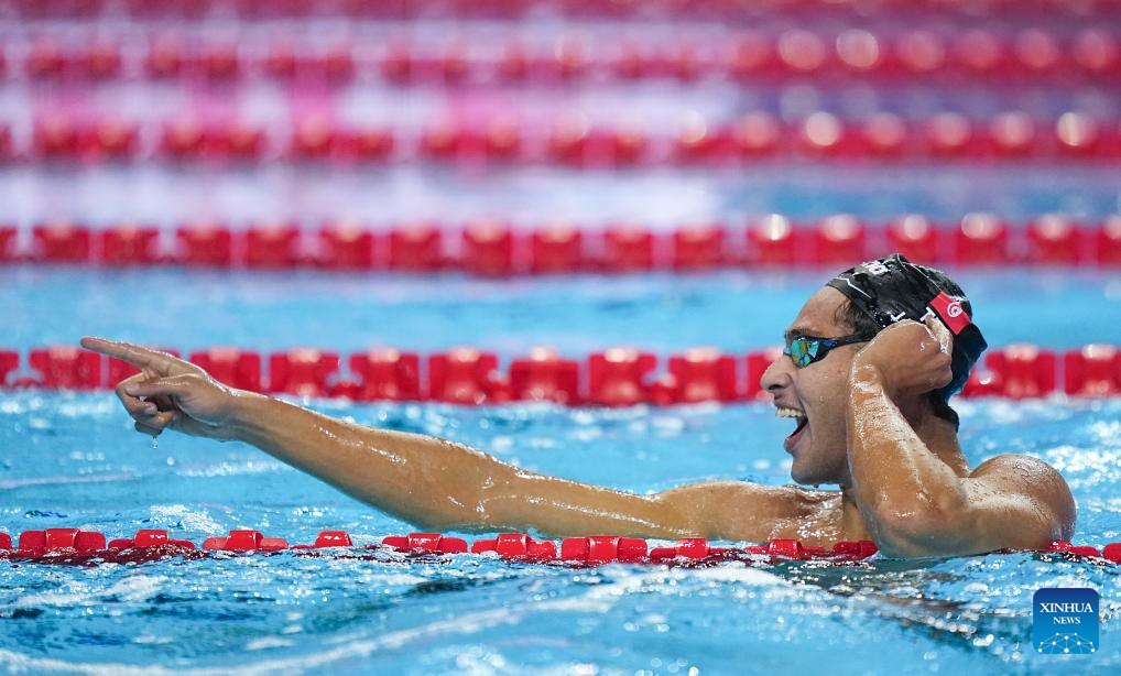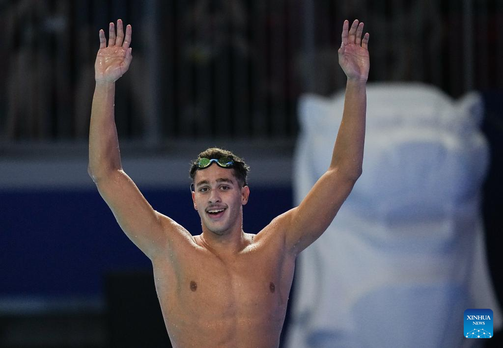 Ahmed Jaouadi of Tunisia celebrates after the men's 800m freestyle final of swimming at the World Aquatics Championships in Singapore, July 30, 2025. (Xinhua/Xia Yifang)