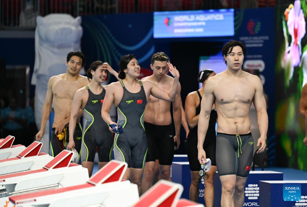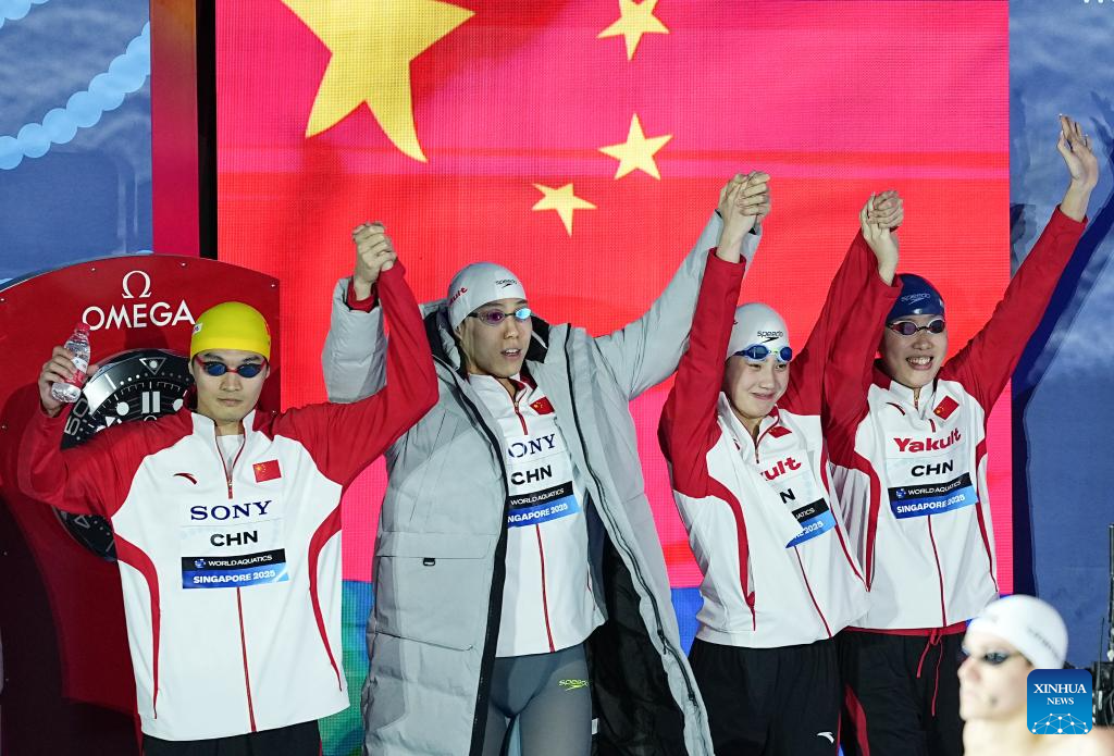 Team China's Zhang Yufei (2nd R, top), Xu Jiayu (2nd L, top), Wu Qingfeng (bottom) and Qin Haiyang are seen after the mixed 4x100m medley relay final of swimming at the World Aquatics Championships in Singapore, July 30, 2025. (Xinhua/Xue Yuge)
