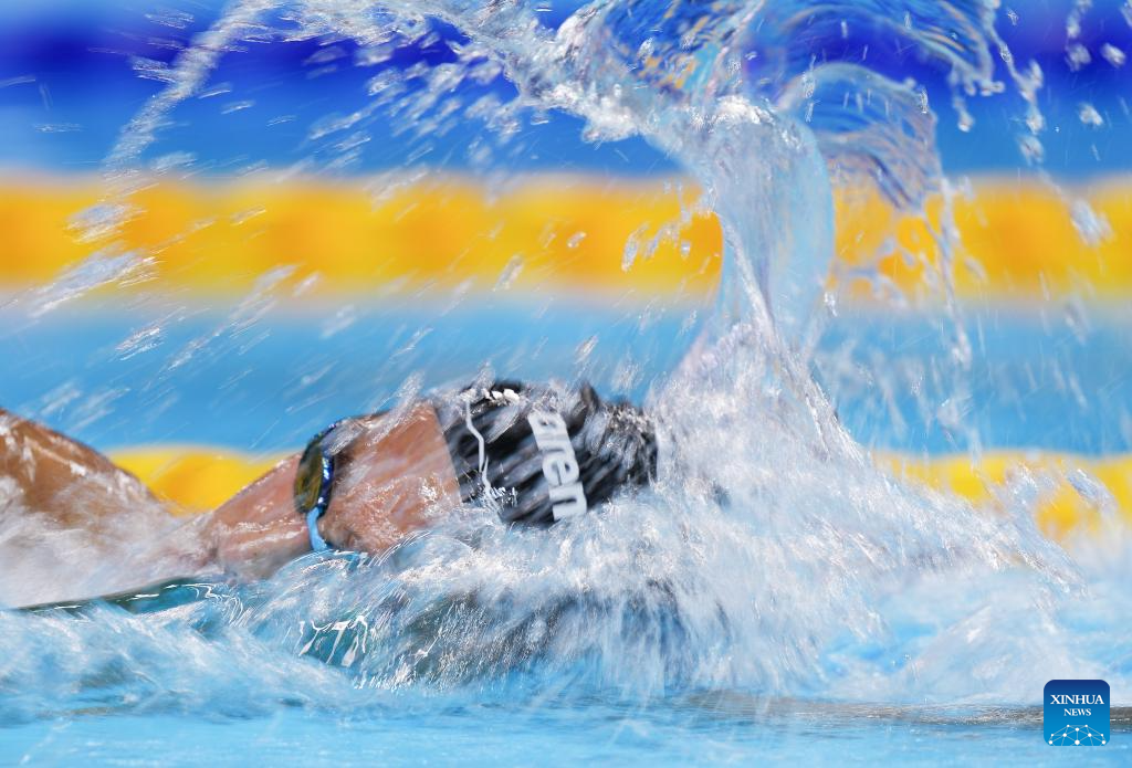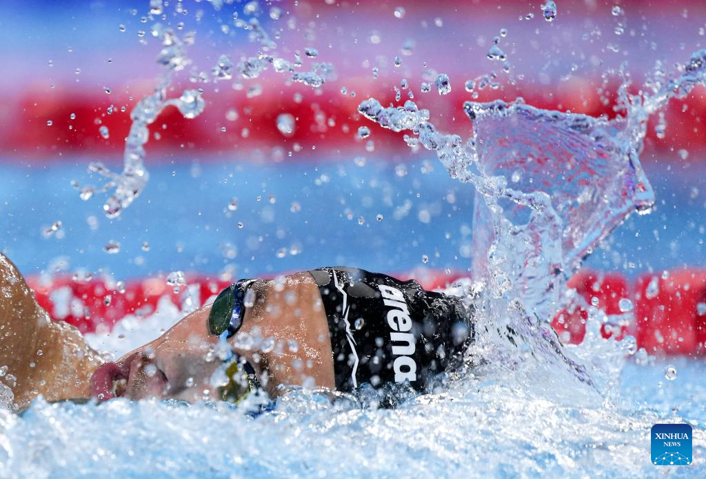 Ahmed Jaouadi of Tunisia competes during the men's 800m freestyle final of swimming at the World Aquatics Championships in Singapore, July 30, 2025. (Xinhua/Xia Yifang)