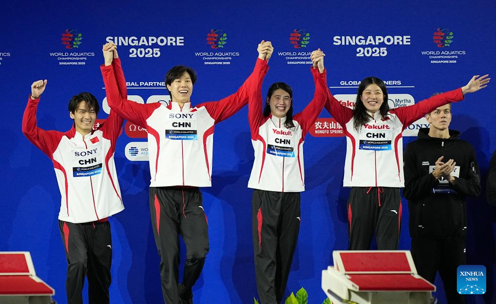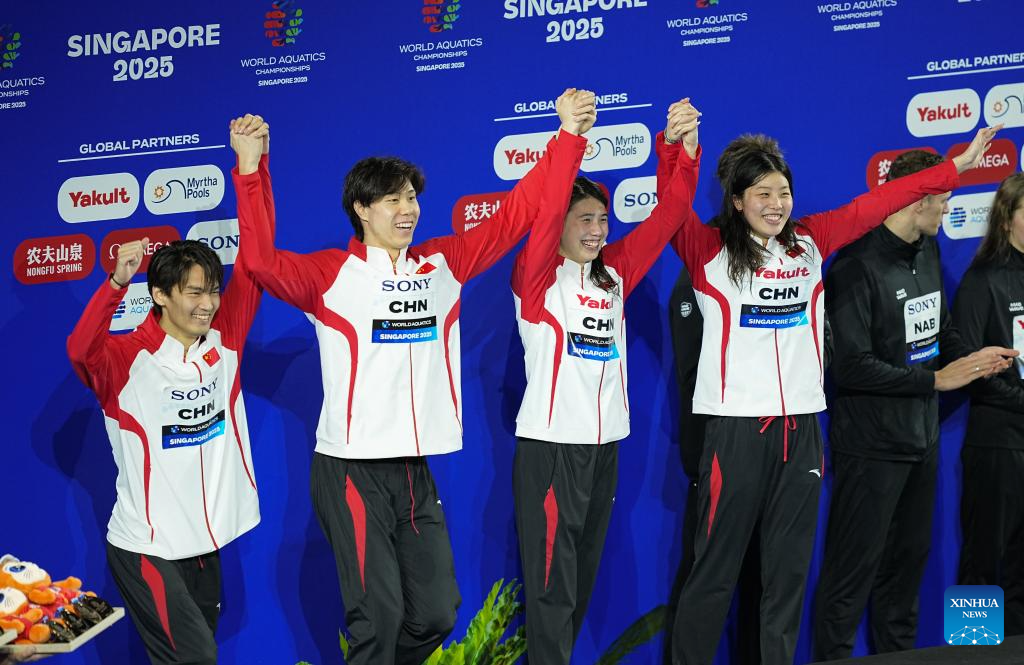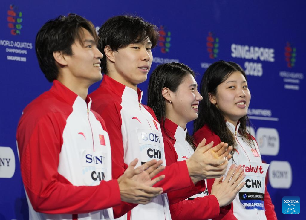Team China's Xu Jiayu, Qin Haiyang, Zhang Yufei and Wu Qingfeng (L to R) celebrate during the awarding ceremony for the mixed 4x100m medley relay final of swimming at the World Aquatics Championships in Singapore, July 30, 2025. (Xinhua/Xue Yuge)