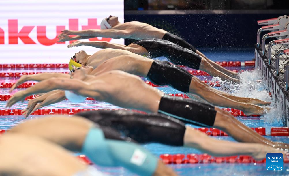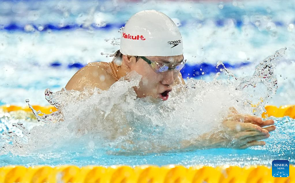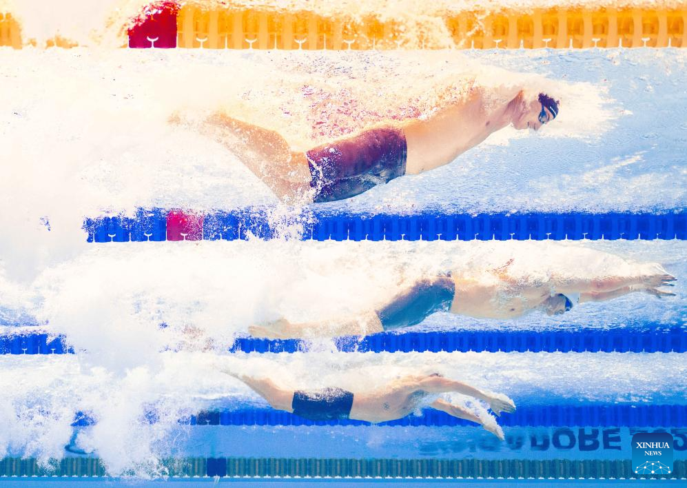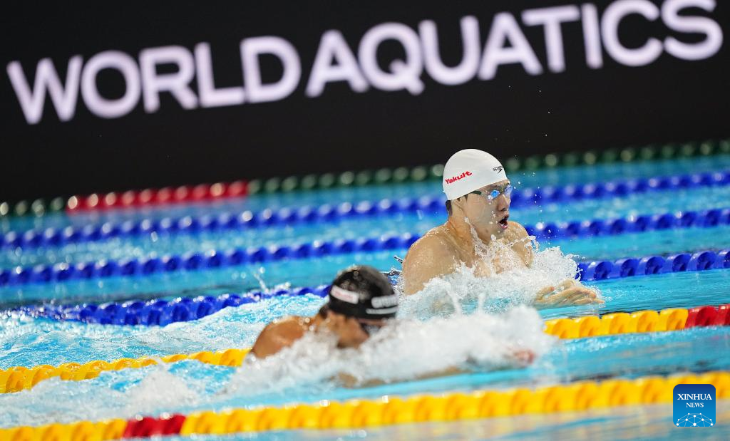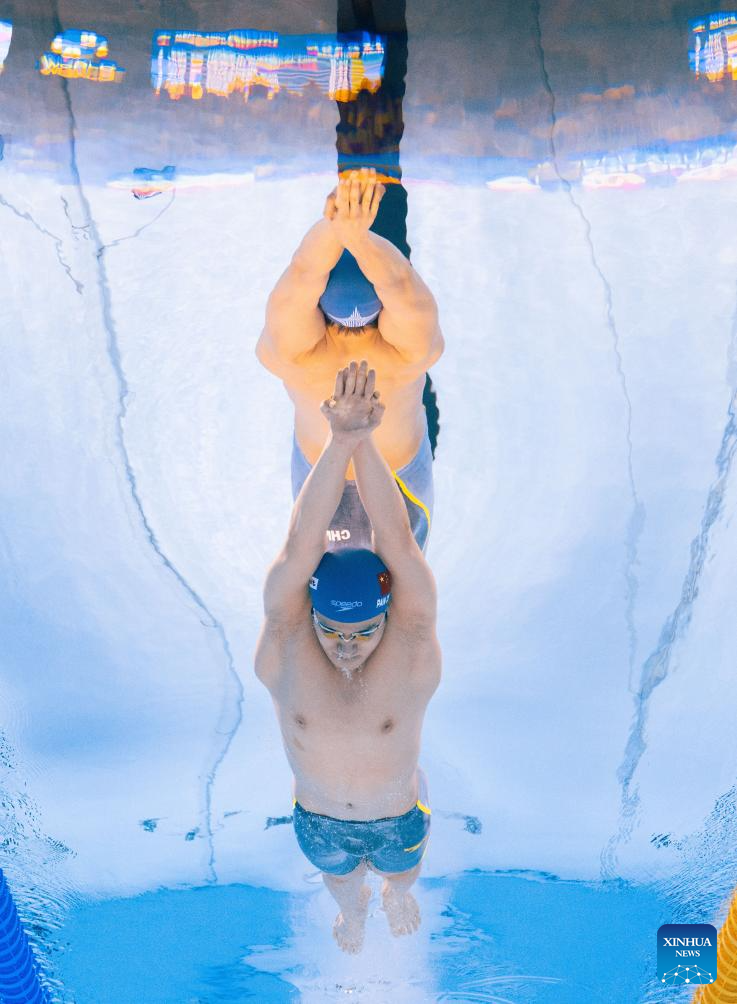 Wang Shun (C) of China competes during the men's 200m individual medley semifinal of swimming at the World Aquatics Championships in Singapore, July 30, 2025. (Xinhua/Xue Yuge)
