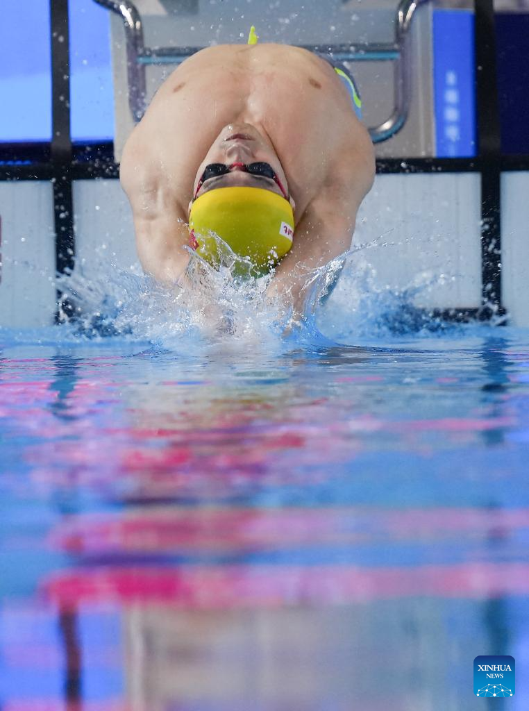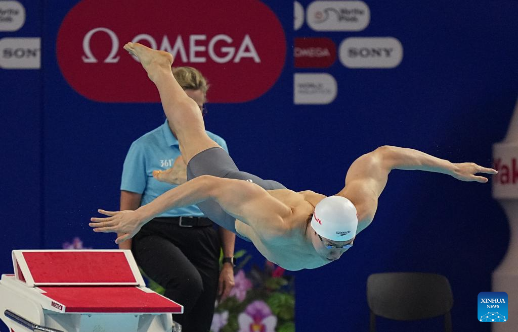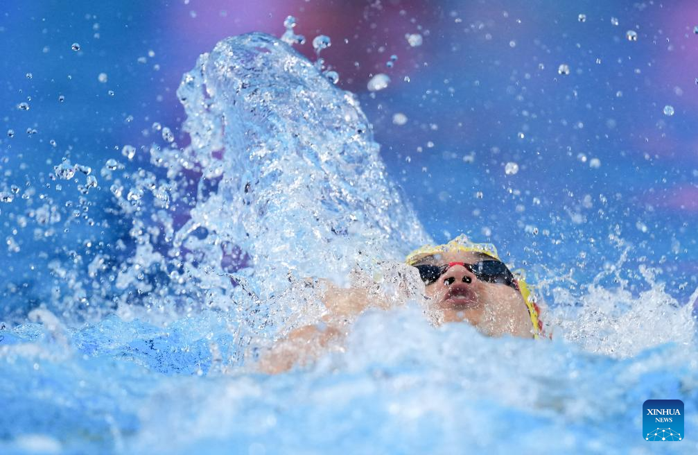 Team China's Xu Jiayu competes during the mixed 4x100m medley relay final of swimming at the World Aquatics Championships in Singapore, July 30, 2025. (Xinhua/Wu Zhizun)