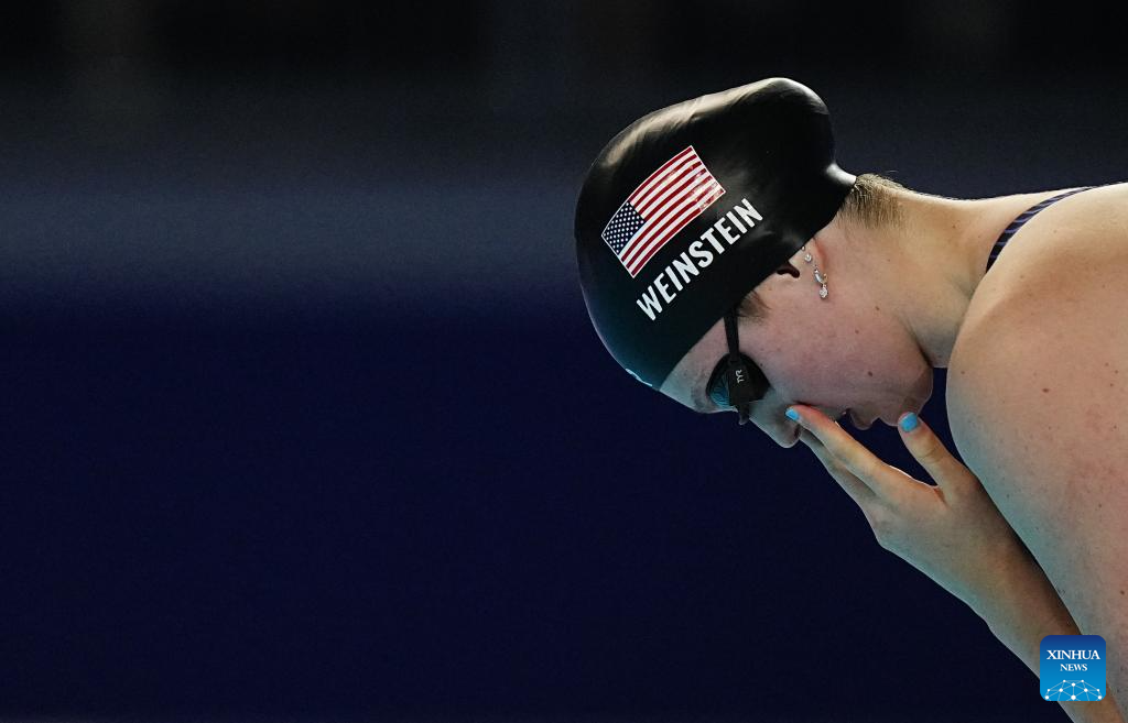 Claire Weinstein of the United States is seen before the women's 200m freestyle final of swimming at the World Aquatics Championships in Singapore, July 30, 2025. (Xinhua/Xia Yifang)