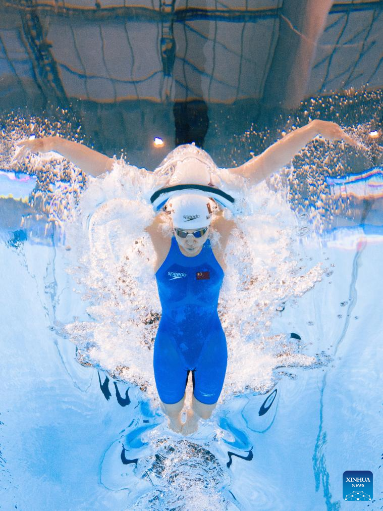 Team China's Wu Qingfeng competes during the mixed 4x100m medley relay final of swimming at the World Aquatics Championships in Singapore, July 30, 2025. (Xinhua/Xia Yifang)