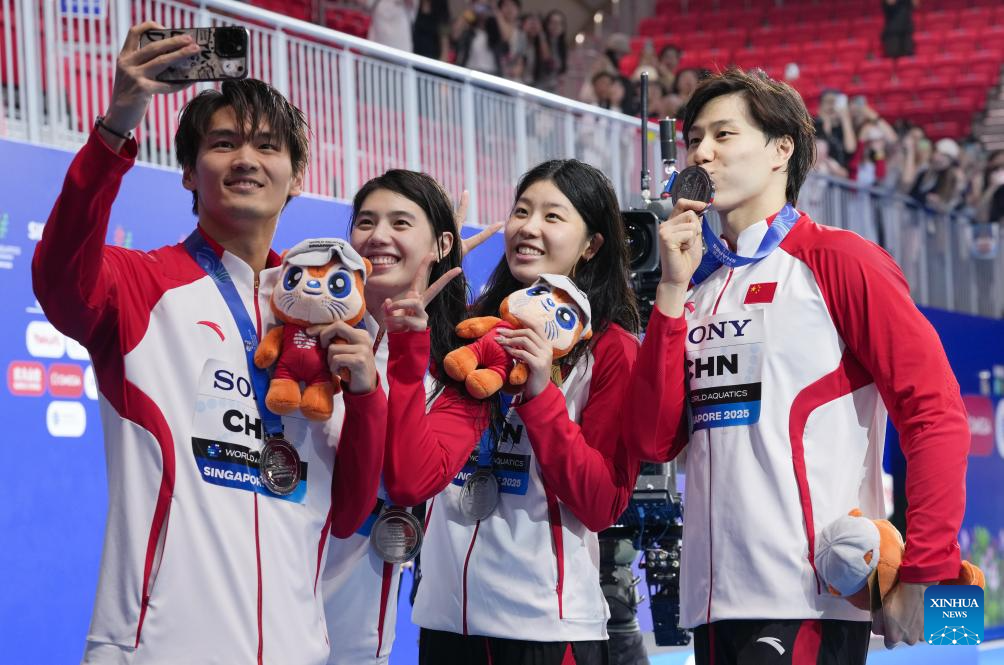 Team China's Xu Jiayu, Zhang Yufei, Wu Qingfeng and Qin Haiyang (L to R) take photos after the awarding ceremony for the mixed 4x100m medley relay final of swimming at the World Aquatics Championships in Singapore, July 30, 2025. (Xinhua/Wu Zhizun)