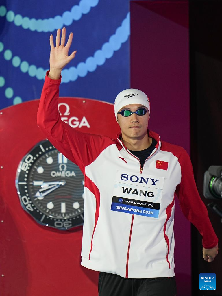 Wang Shun of China waves to the spectators before the men's 200m individual medley semifinal of swimming at the World Aquatics Championships in Singapore, July 30, 2025. (Xinhua/Xia Yifang)