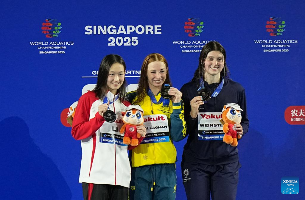 Gold medalist Mollie O'Callaghan (C) of Australia, silver medalist Li Bingjie (L) of China and bronze medalist Claire Weinstein of the United States pose during the awarding ceremony for the women's 200m freestyle final of swimming at the World Aquatics Championships in Singapore, July 30, 2025. (Xinhua/Xia Yifang)