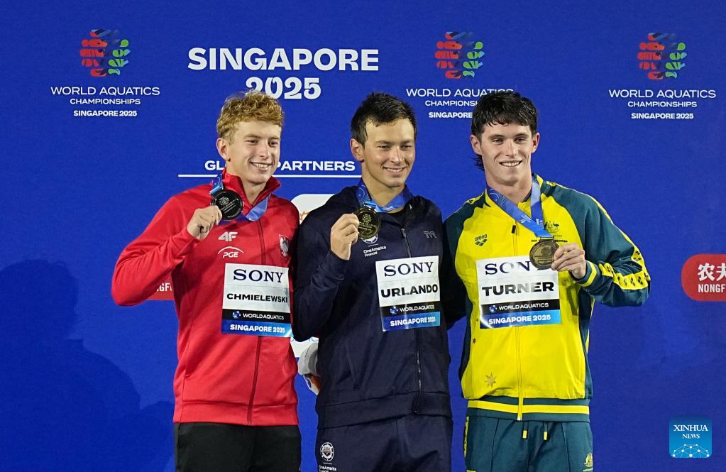 Gold medalist Luca Urlando (C) of the United States, silver medalist Krzysztof Chmielewski (L) of Poland and bronze medalist Harrison Turner of Australia pose during the awarding ceremony for the men's 200m butterfly final of swimming at the World Aquatics Championships in Singapore, July 30, 2025. (Xinhua/Wu Zhizun)