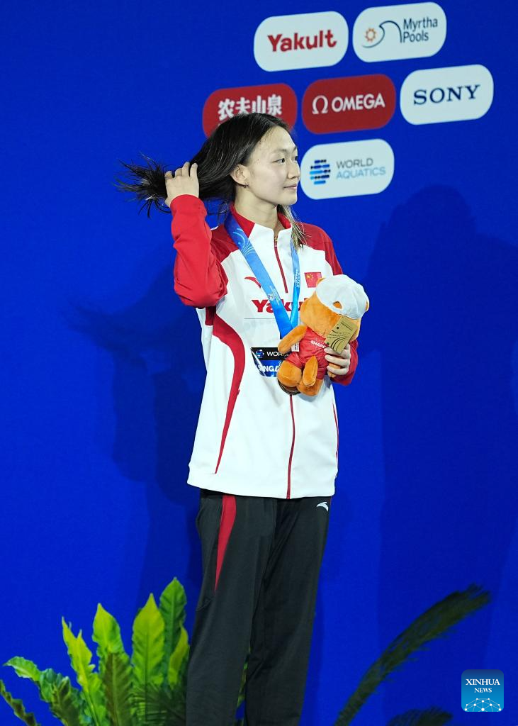 Silver medalist Li Bingjie of China is seen during the awarding ceremony for the women's 200m freestyle final of swimming at the World Aquatics Championships in Singapore, July 30, 2025. (Xinhua/Xue Yuge)