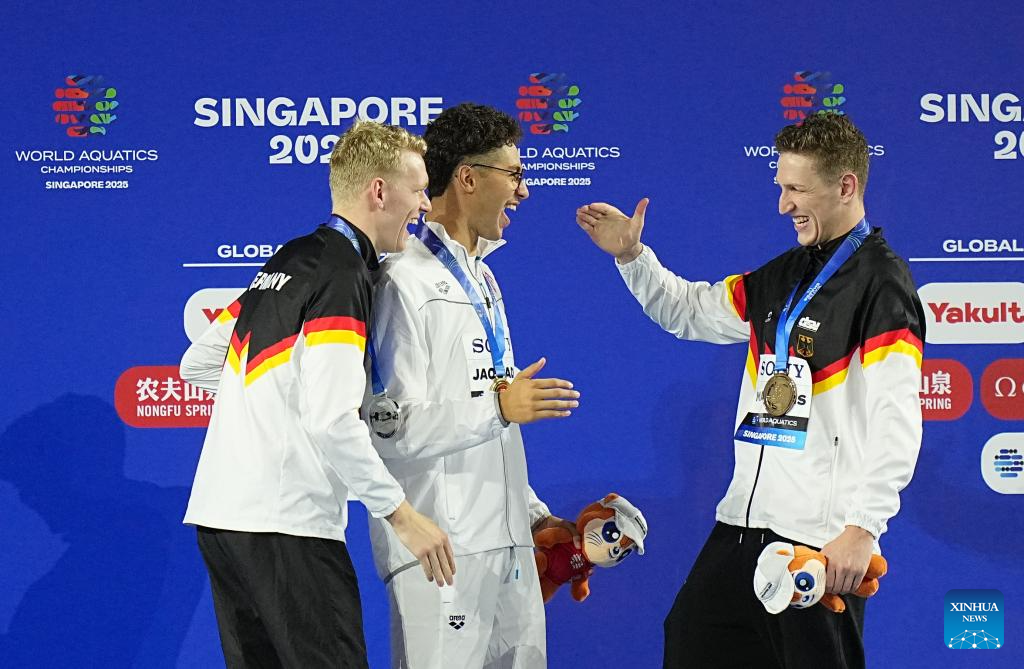Bronze medalist Lukas Maertens (R) of Germany celebrates with gold medalist Ahmed Jaouadi (C) of Tunisia and silver medalist Sven Schwarz of Germany during the awarding ceremony for the men's 800m freestyle final of swimming at the World Aquatics Championships in Singapore, July 30, 2025. (Xinhua/Xia Yifang)