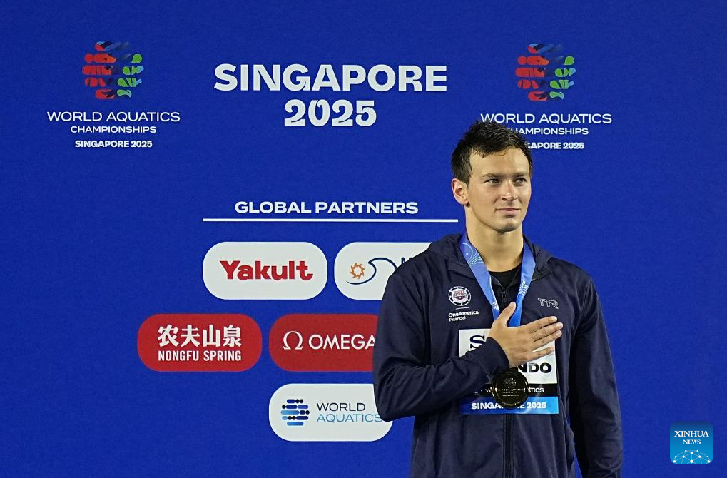 Luca Urlando of the United States is seen during the awarding ceremony for the men's 200m butterfly final of swimming at the World Aquatics Championships in Singapore, July 30, 2025. (Xinhua/Xia Yifang)