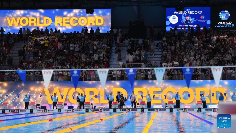 Leon Marchand (2nd R, front) of France reacts after setting a new world record after the men's 200m individual medley semifinal of swimming at the World Aquatics Championships in Singapore, July 30, 2025. (Xinhua/Wu Zhizun)