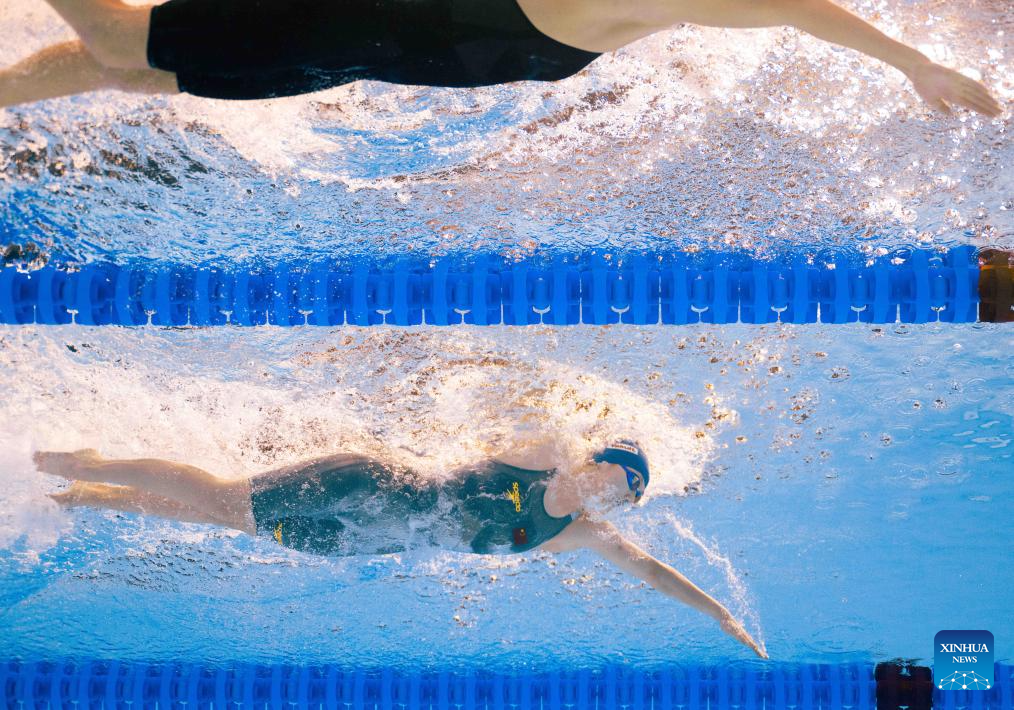 Li Bingjie (bottom) of China competes during the women's 200m freestyle final of swimming at the World Aquatics Championships in Singapore, July 30, 2025. (Xinhua/Xue Yuge)