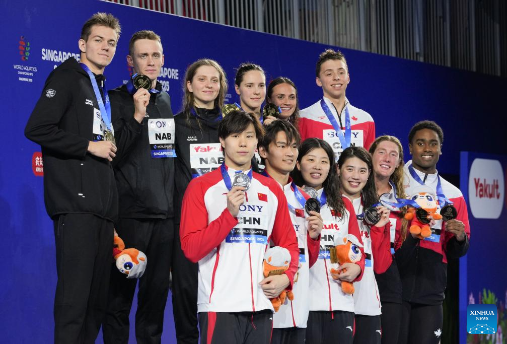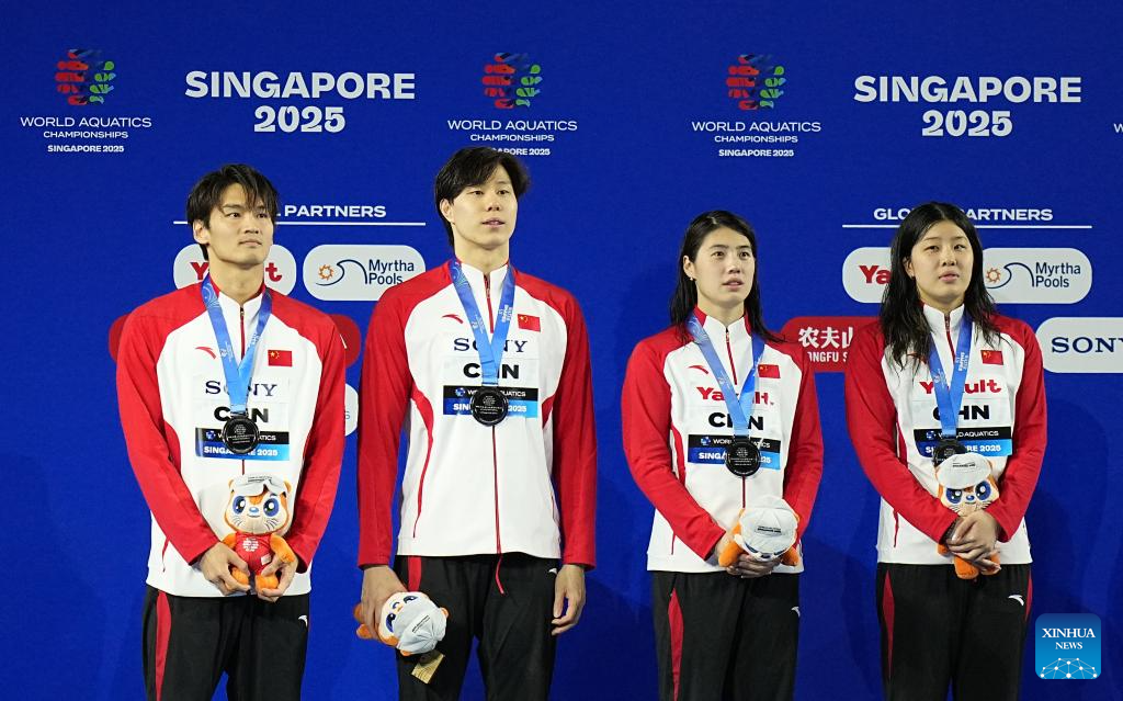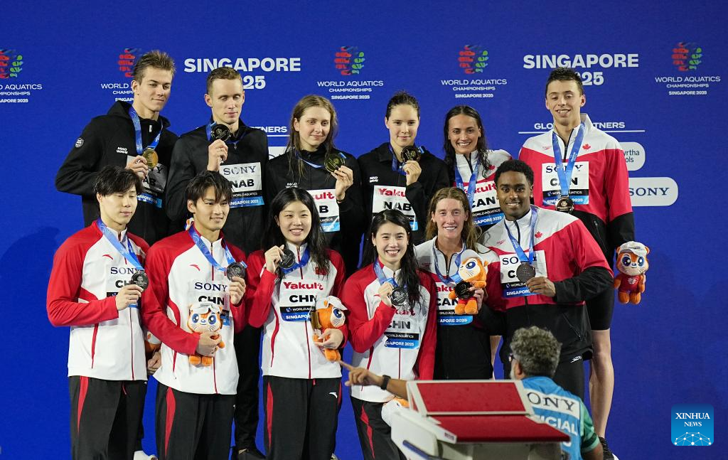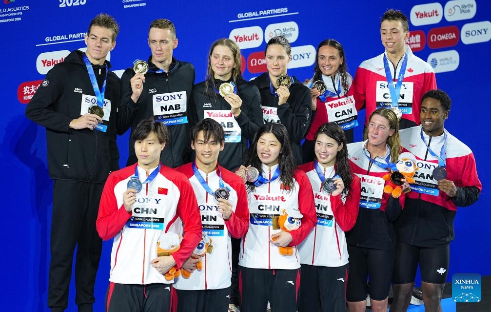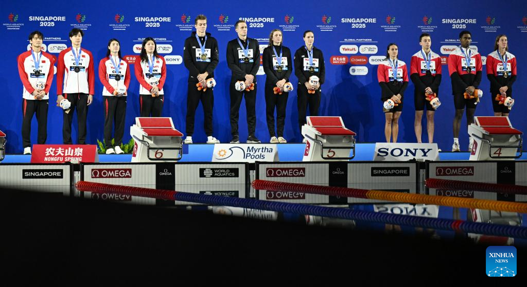 Medalists are seen during the awarding ceremony for the mixed 4x100m medley relay final of swimming at the World Aquatics Championships in Singapore, July 30, 2025. (Xinhua/Xia Yifang)