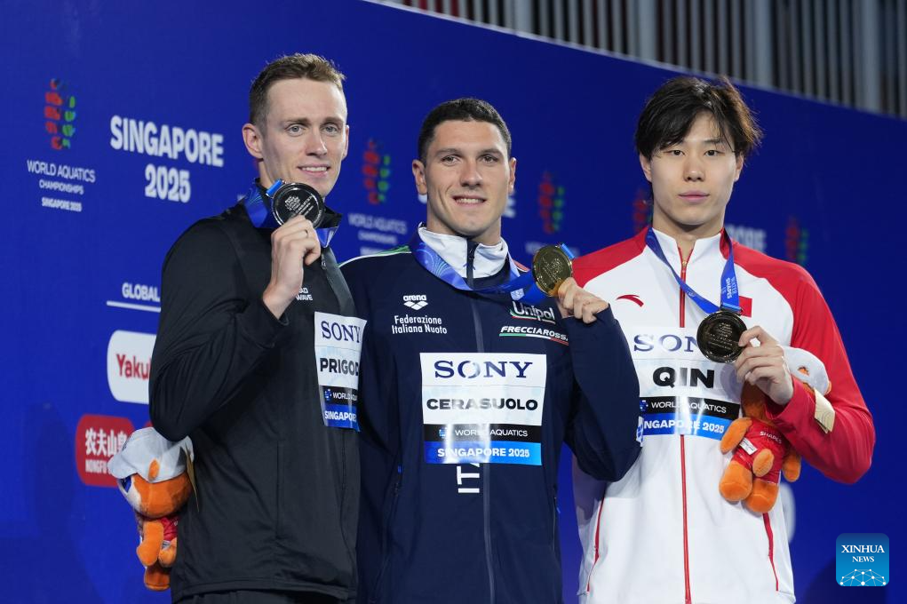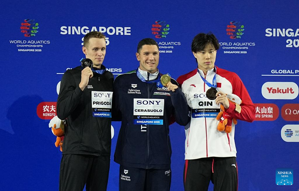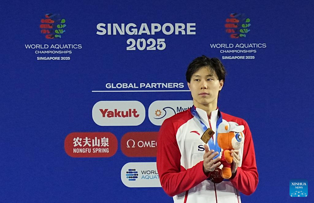 Bronze medalist Qin Haiyang of China is seen during the awarding ceremony for the men's 50m breaststroke final of swimming at the World Aquatics Championships in Singapore, July 30, 2025. (Xinhua/Xia Yifang)